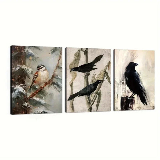 3pcs Vintage Style Crow and Corn Stalk Wall Art Set Canvas Framed 40x60cm - High Quality Print 100% Australian Made Wall Canvas Ready to Hang
