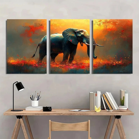 3pcs Abstract Elephant Vibrant Orange & Blue Metal Print Ready to Hang Art