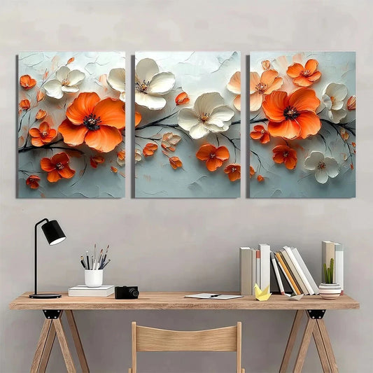 3pcs Vibrant Floral Abstract Orange White Flowers Metal Print Ready to Hang Art