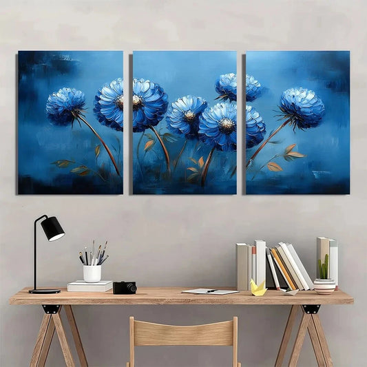 3pcs Vibrant Blue Dandelion Flowers & Green Leaves Metal Print Ready to Hang Art