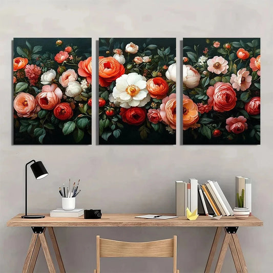 3pcs Vintage Red & White Roses Gray Leaves Metal Print Ready to Hang Art