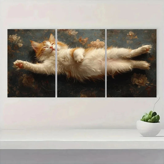 3pcs Vibrant Whimsical Cat in Orange Dress Metal Print Ready to Hang Art