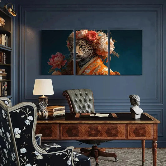 3pcs Elegant Leopard Floral Crown Orange Kimono Metal Print Ready to Hang Art