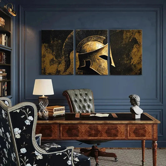 3pcs Ancient Greek Helmet Art Golden Warrior Metal Print Ready to Hang Art