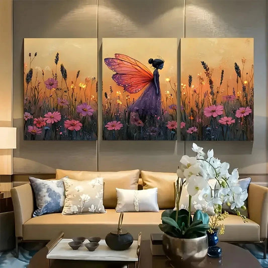 3pcs Vibrant Purple & Pink Floral Fairy with Wings Metal Print Ready to Hang Art