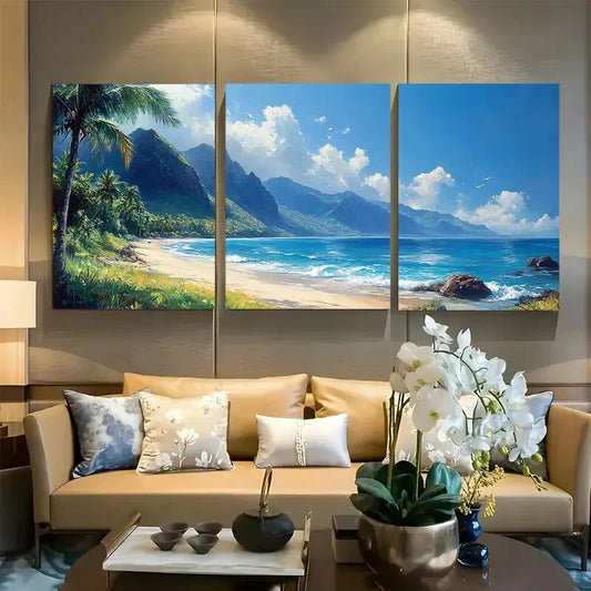 3pcs Tropical Beach with Palm Tree & Mountain View Metal Print Ready to Hang Art