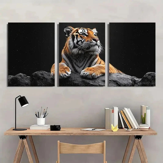 3pcs Black & White Tiger on Rocks Starry Night Metal Print Ready to Hang Art
