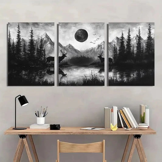3pcs Black and White Full Moon and Mountains Metal Print Ready to Hang Art