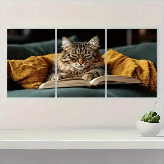 3pcs Playful Reading Cat Design Metal Print Ready to Hang Art
