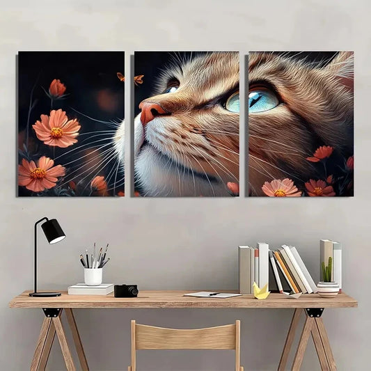 3pcs Vibrant Cat and Flower Blue Eyed Cat Metal Print Ready to Hang Art