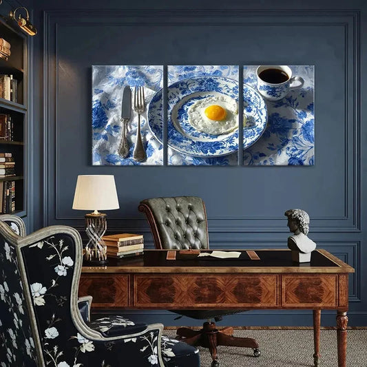 3pcs Breakfast Scene with Blue & White Porcelain Metal Print Ready to Hang Art