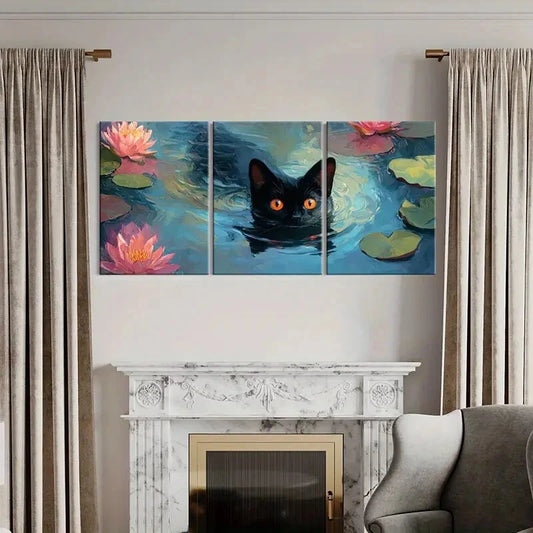 3pcs Black Cat Water Lilies Abstract Art Metal Print Ready to Hang Art