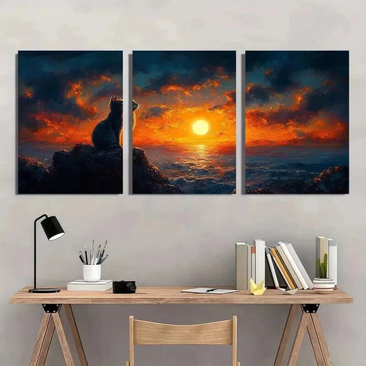 3pcs Sunset Ocean Scene with Black Cat Wall Art Set Canvas Framed 40x60cm - High Quality Print 100% Australian Made Wall Canvas Ready to Hang