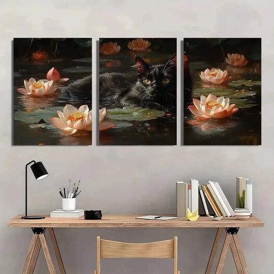 3pcs Black Cat Swimming in Lotus Pond Wall Art Set Canvas Framed 40x60cm - High Quality Print 100% Australian Made Wall Canvas Ready to Hang