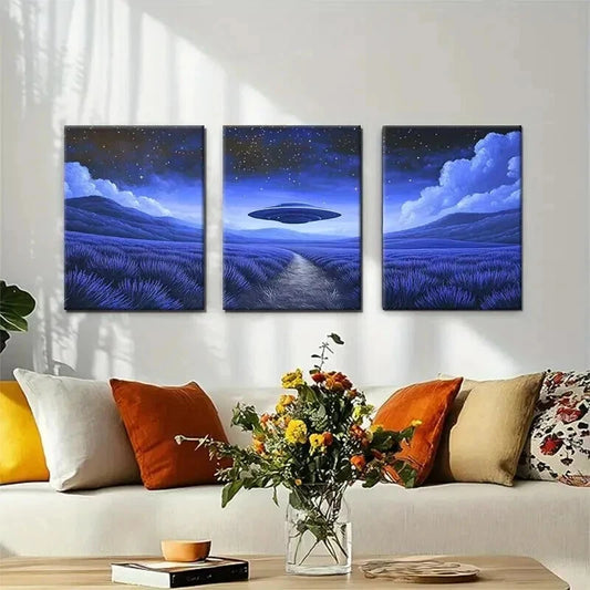 3pcs UFO Night Landscape Spaceship Perfect Wall Art Set Canvas Framed 40x60cm - High Quality Print 100% Australian Made Wall Canvas Ready to Hang