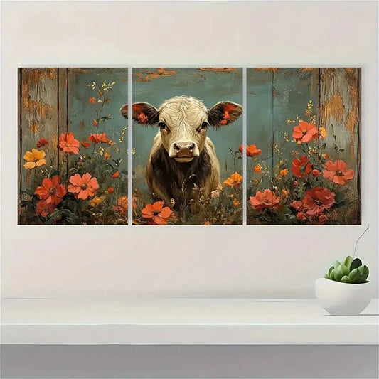 3pcs Land Cow Rustic Wildlife Floral Accents Metal Print Ready to Hang Art