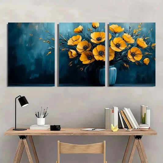 3pcs Abstract Vibrant Blue & Yellow Floral Wall Art Set Canvas Framed 40x60cm - High Quality Print 100% Australian Made Wall Canvas Ready to Hang