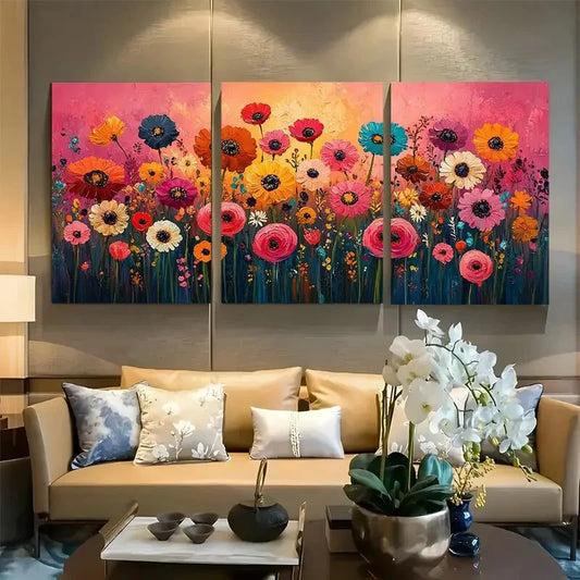 3pcs Dreamlike Field of Neon Flowers Metal Print Ready to Hang Art