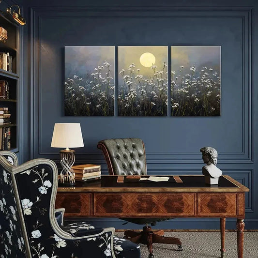 3pcs Moonlit Floral Garden Night Sky Full Moon Metal Print Ready to Hang Art