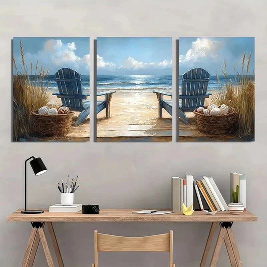 3pcs Beach Scene Chairs & Seashell Basket Metal Print Ready to Hang Art
