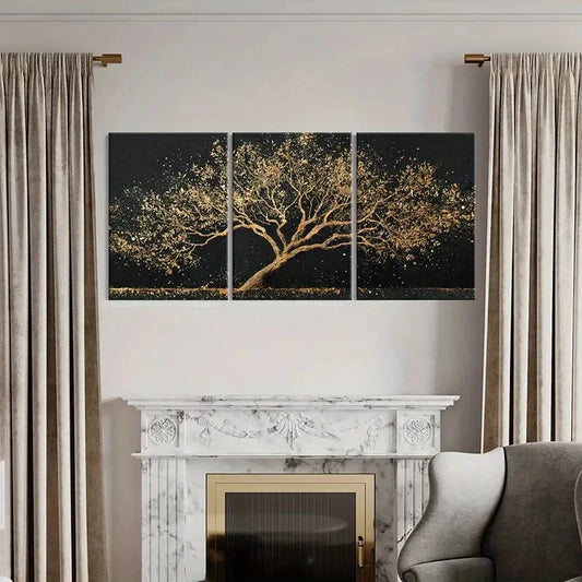 3pcs Golden Tree with Sparkling Leaves Metal Print Ready to Hang Art