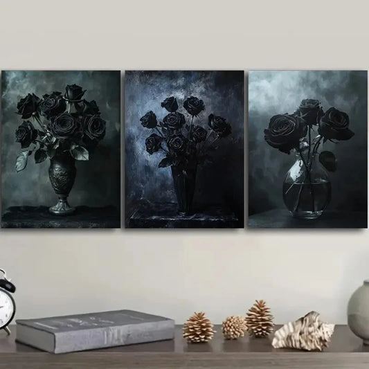 3pcs Featuring Design of Black Roses Vase Metal Print Ready to Hang Art