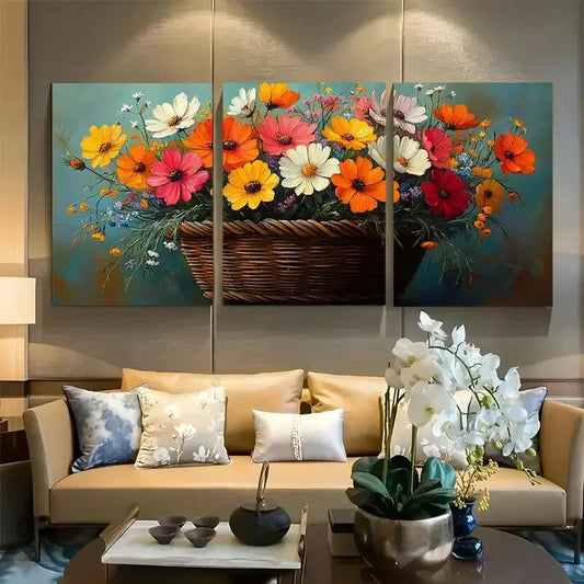 3pcs Rustic Wildflower Basket Meadow Blooms Design Metal Print Ready to Hang Art