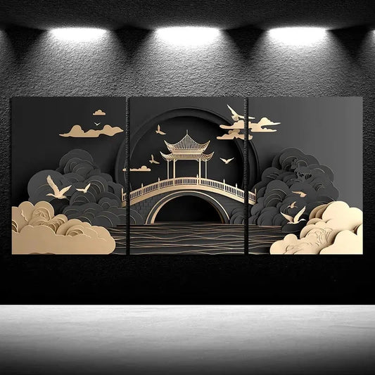 3pcs Beautiful Arch Bridge Golden Themed Metal Print Ready to Hang Art
