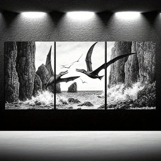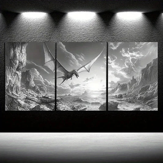 3pcs Dragons Flying On The Coast Black & White Metal Print Ready to Hang Art