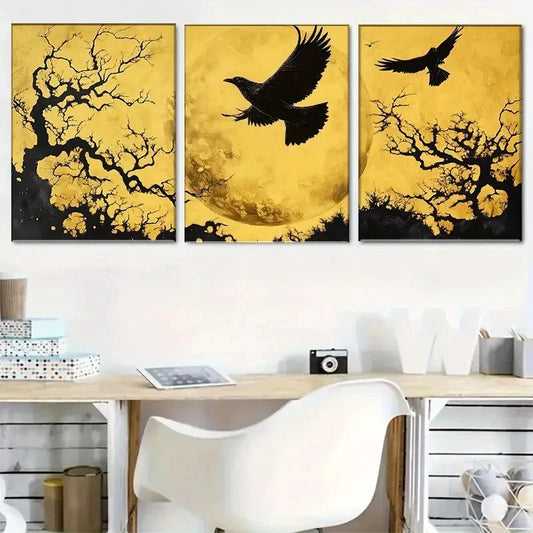 3pcs Moonlit Raven Flying Crows Golden Perfect Wall Art Set Canvas Framed 40x60cm - High Quality Print 100% Australian Made Wall Canvas Ready to Hang