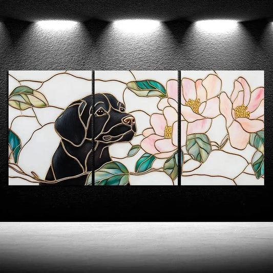 3pcs Dogs in Pink Flowers And Green Leaves Metal Print Ready to Hang Art