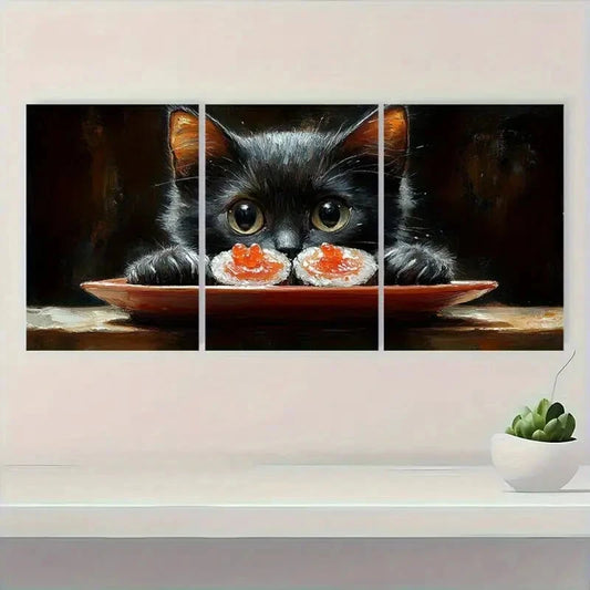 3pcs Charming Black Cat & Sushi Whimsical Metal Print Ready to Hang Art