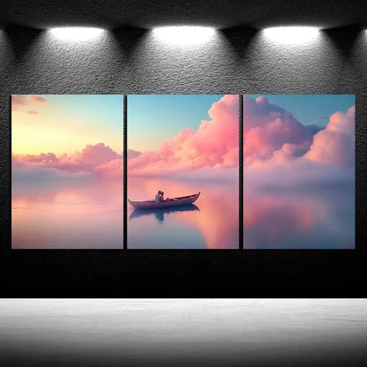 3pcs A Ship in the Pink Sea of Clouds Metal Print Ready to Hang Art