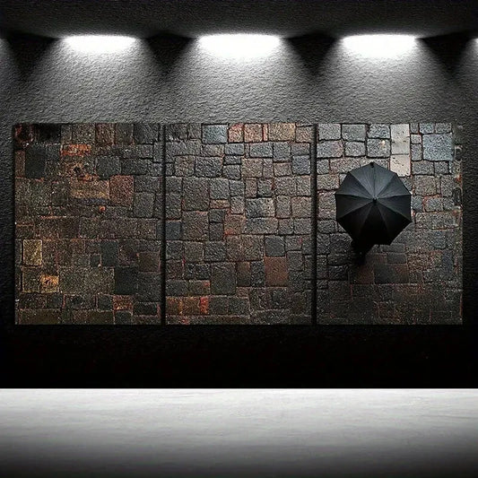3pcs People holding red Umbrellas on Rainy Metal Print Ready to Hang Art