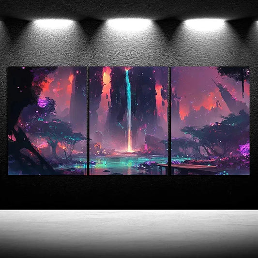 3pcs Fantasy Waterfall and Wooden Bridge Scenery Metal Print Ready to Hang Art