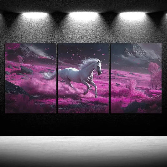 3pcs A Galloping Horse in The Pink Grass Metal Print Ready to Hang Art