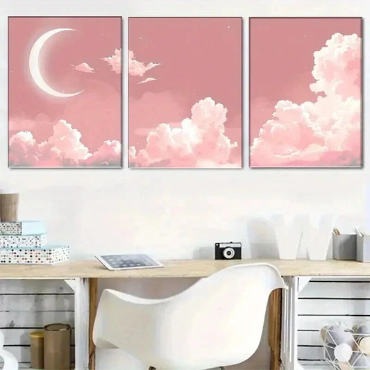 3pcs Pink Moon & Clouds Starrcy Sky Perfect Wall Art Set Canvas Framed 40x60cm - High Quality Print 100% Australian Made Wall Canvas Ready to Hang