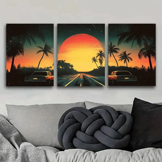 3pcs Retro Sunset Road with Palm Trees Perfect Wall Art Set Canvas Framed 40x60cm - High Quality Print 100% Australian Made Wall Canvas Ready to Hang
