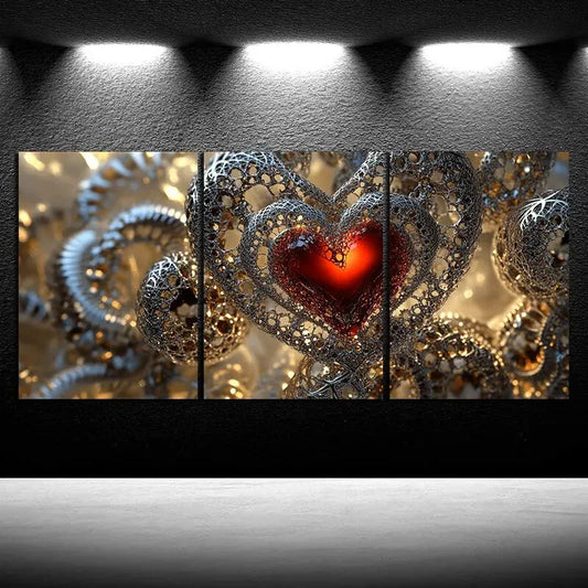 3pcs Love Themed Red Heart Silver Themed Metal Print Ready to Hang Art