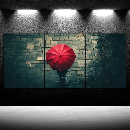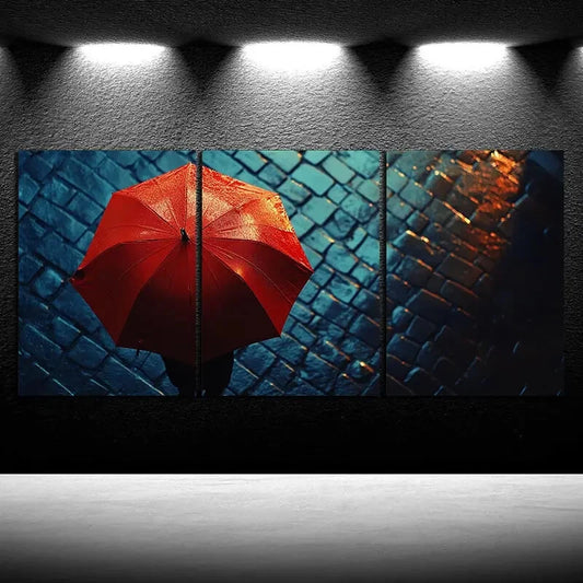 3pcs People with Red Umbrellas on Rainy Streets Metal Print Ready to Hang Art
