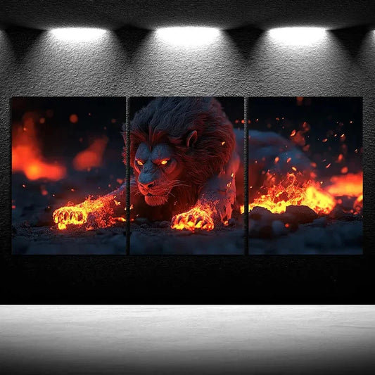 3pcs Abstract Running Lion Fire Effect Metal Print Ready to Hang Art