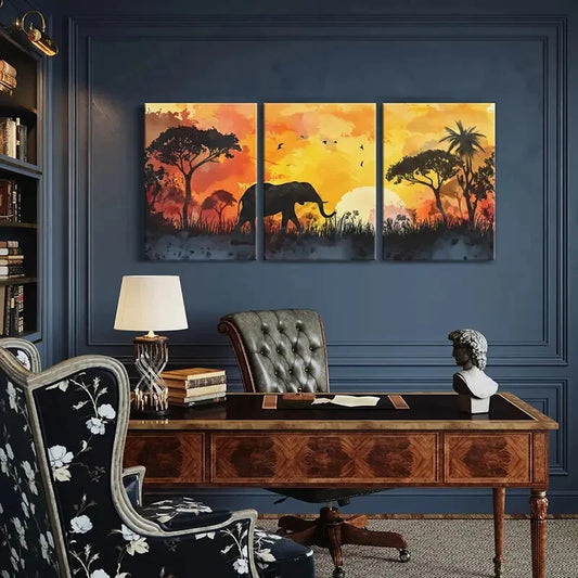 3pcs African Sunset Silhouette Elephant Landscape Metal Print Ready to Hang Art
