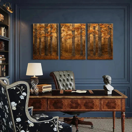 3pcs Autumn Forest Landscape Warm Tones Metal Print Ready to Hang Art
