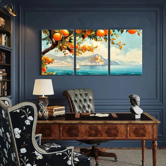 3pcs Orange Tree Sailboat Castle Mountain View Metal Print Ready to Hang Art