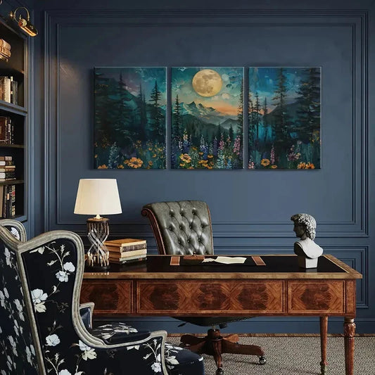 3pcs Moonlit Forest Landscape Floral Meadow Metal Print Ready to Hang Art
