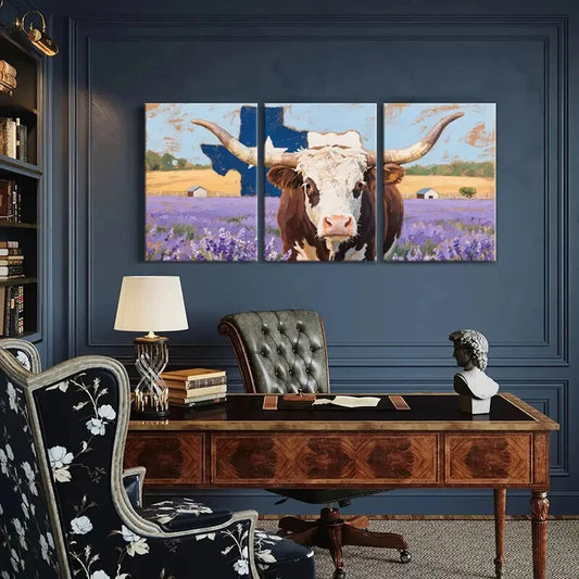 3pcs Lavender Field Rustic Texas Longhorn Cow Metal Print Ready to Hang Art