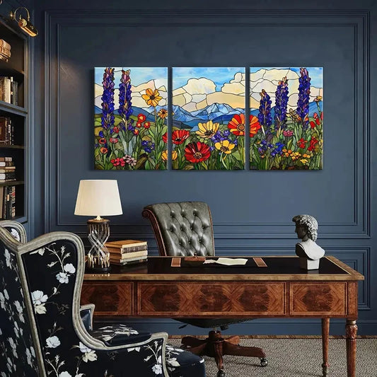 3pcs Stained Glass Wildflowers Mountain Landscape Metal Print Ready to Hang Art