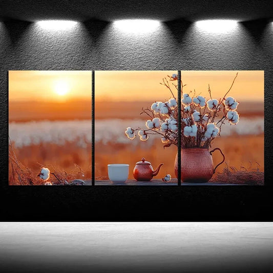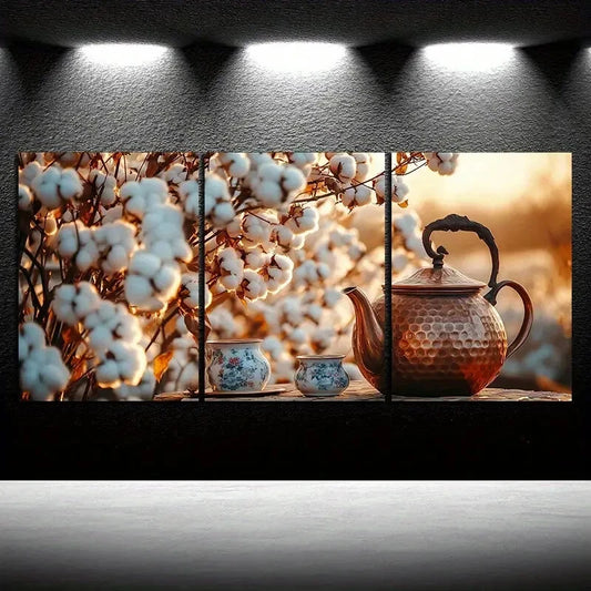 3pcs Teapots and Cups in The Fields Sunrise Metal Print Ready to Hang Art