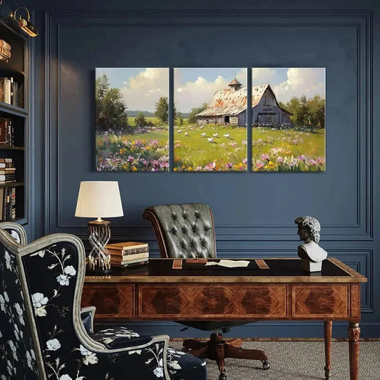 3pcs Vintage Farmhouse Scene with Wildflowers Metal Print Ready to Hang Art