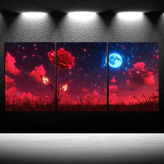 3pcs Red Rose and Moonlight Night Sky Metal Print Ready to Hang Art